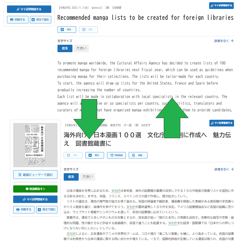 Students can quickly retrieve articles of interest from the fully indexed archive using keyword or full text searching. Those who are unsure of the precise kanji character can enter hiragana and katakana instead (choosing "Keyword Search" instead of "Full-Text Search"). Articles appear in a screen-friendly text view, while Japanese articles from December 2008 onwards include a clipping image which shows the article as it originally appeared in print, complete with photos, illustrations and graphics. To help students of Japanese, most English articles from July 2011 onwards contain a link to the original Japanese article.